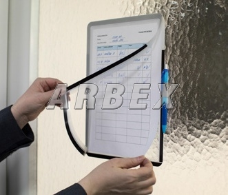 - Zadní stranu tvoří PVC samolepicí fólie. Čelní strana je bez krycí fólie jedná se pouze o pevný lem rámečku, který je podložen magnetickými pruhy spolehlivě fixující vložený dokument.