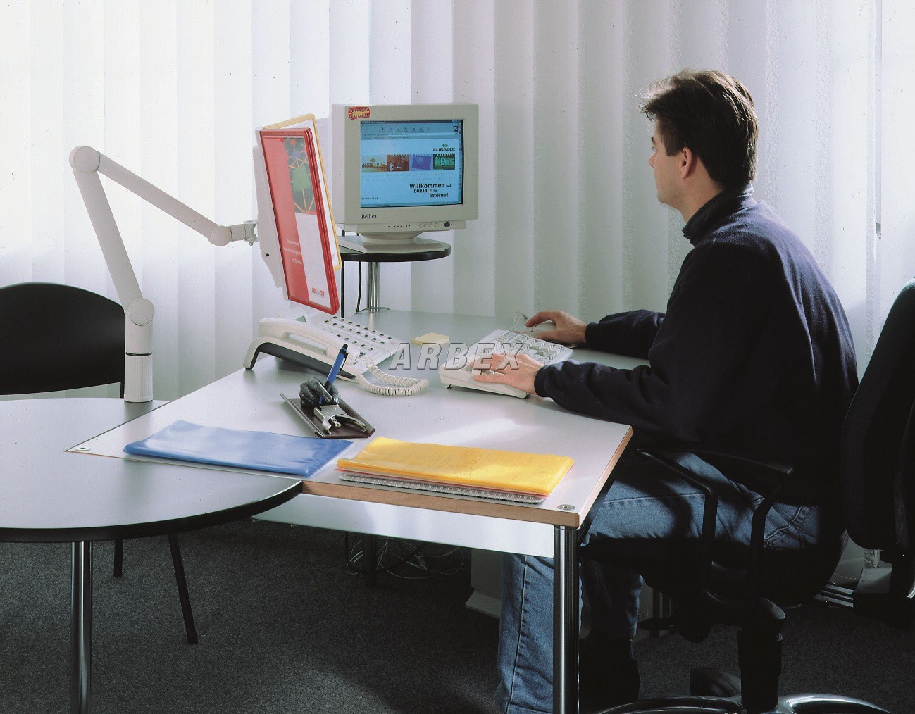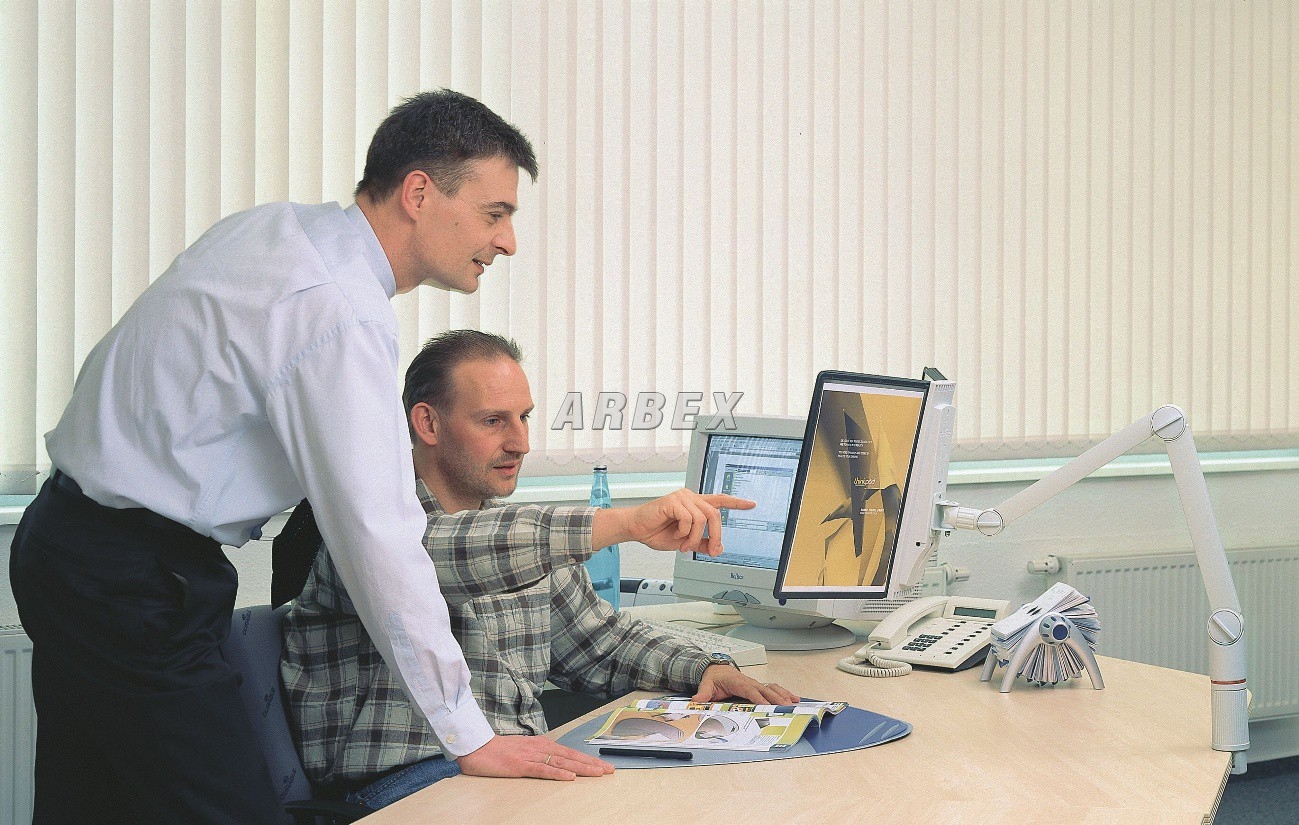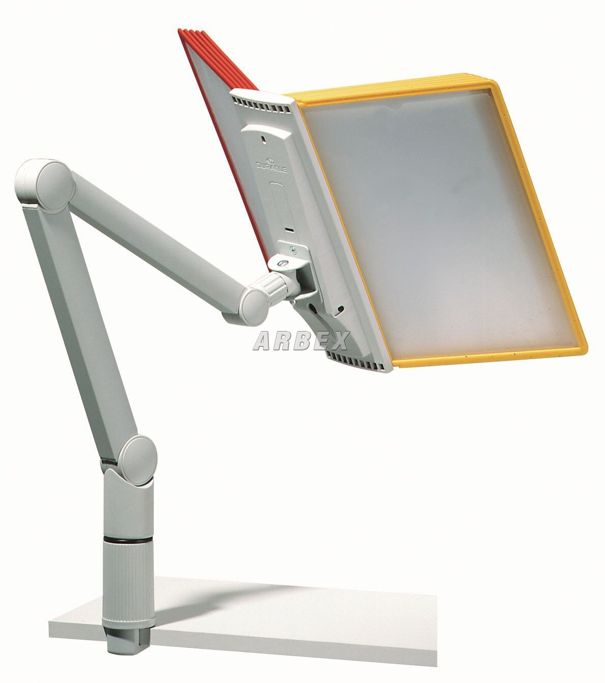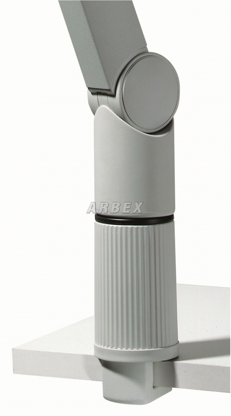 Stabilní otočné rameno elegantně tvarované, s namontovaným držákem na 10 tabulí, upevnění ke stolu pomocí svorky, se dvěma kloubovými ramenu z hliníkových profilů a třemi klouby se stavitelnou nosností. Dodává se bez rámečků. Vhodné rámečky Sherpa 5606.