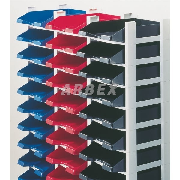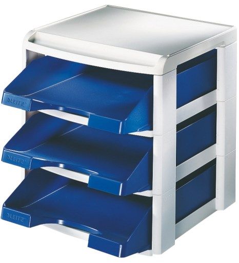 Stabilní stohovací systém je součástí řady plastových doplňků Leitz PLUS. Všechny jeho části jsou vyrobeny z pevného plastu. Skládá se ze 3 stohovacích modulů (poliček), 3 odkladačů Leitz PLUS a vrchního víka.