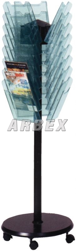 Masivní, mobilní stojan na prospekty. Obsahuje 24 přihrádek formátu A4 na výšku. Výška 165 cm, průměr 52 cm. Barva zásuvek zelená transparentní. Barva podstavce černá.