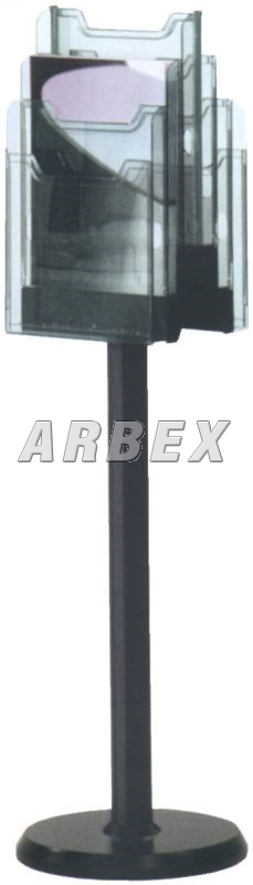 Stabilní otočný držák prospektů se šesti průhlednými přihrádkami formátu A4 na výšku. Výška 108,5 cm, průměr 31,5 cm. Barva zásuvek zelená transparentní. Barva podstavce černá