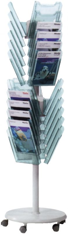 Mobilní stojan na prospekty. Obsahuje 36 přihrádek formátu A4 na výšku. Dvě patra. Oběma patry je možno otáčet nezávisle. Výška 180 cm, průměr 52 cm. Barva zásuvek zelená transparentní. Barva podstavce světle šedá.