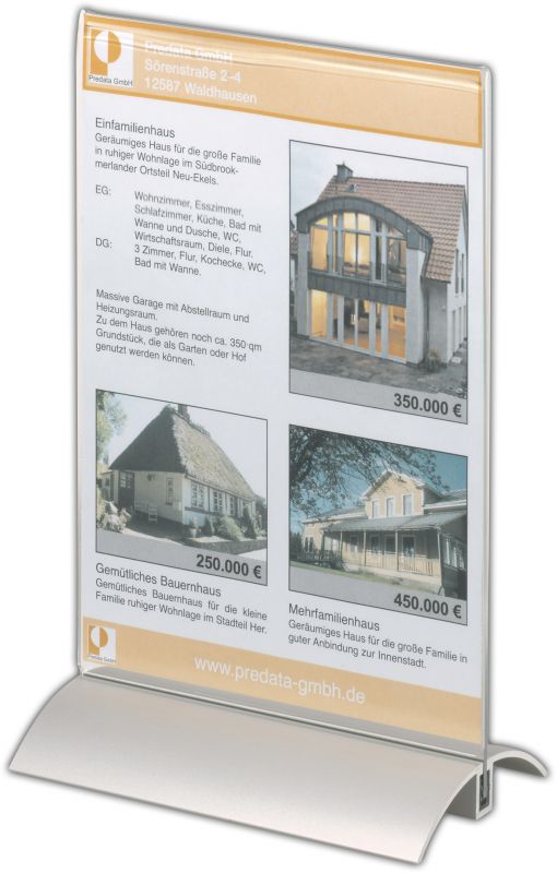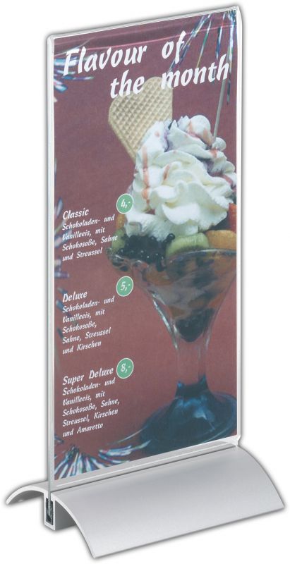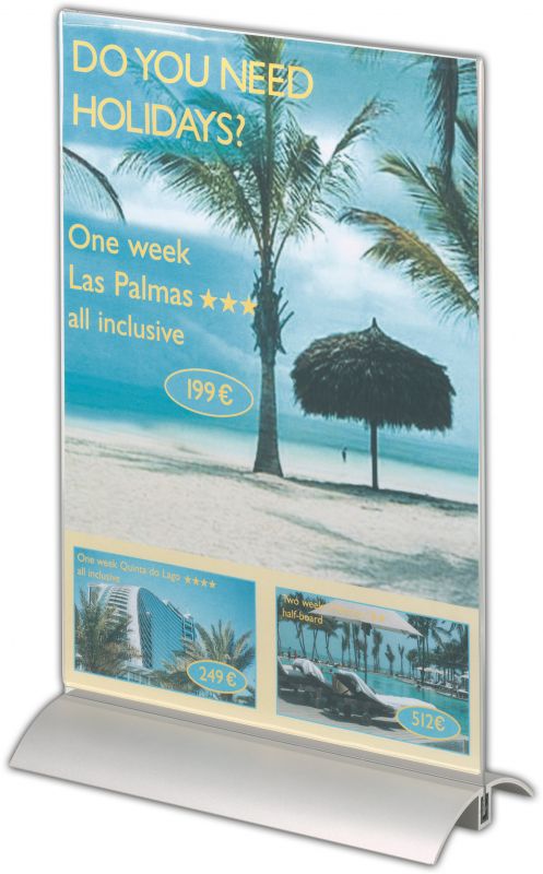 Stojánek na informační letáky, menu, apod. vyrobený z atraktivní kombinace materiálů: podstavec z kvalitního hliníku a tabulky z průzračného akrylu. Vkládání papíru je velmi pohodlné, stojánek je oboustranně využitelný.