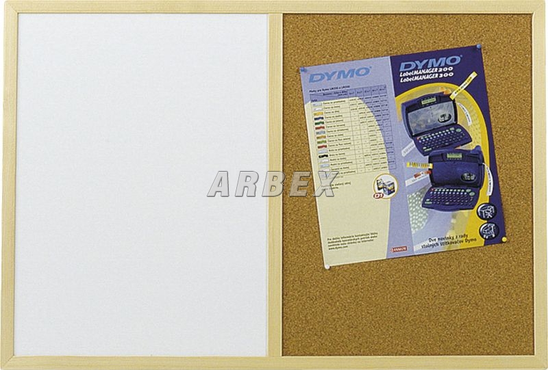 Polovina bílá stíratelná tabule, druhá polovina korková tabule. Dřevěný rám. Součástí balení jsou značkovače, upínáčky, závěsný systém. Rozměr 390x590 mm.