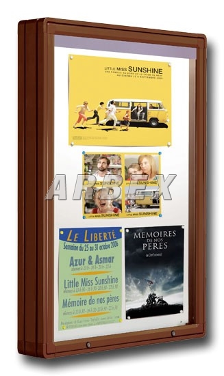 Oboustraná venkovní vitrína z hliníkových profilů. Zaoblené rohy. Výklopné dveře s plynovými vzpěrami. Upevnění na sloupky Quatro. Kombinací se sloupkem Quatro Plus lze sestavit stěnu z volně stojících nástěnek v exteriéru.