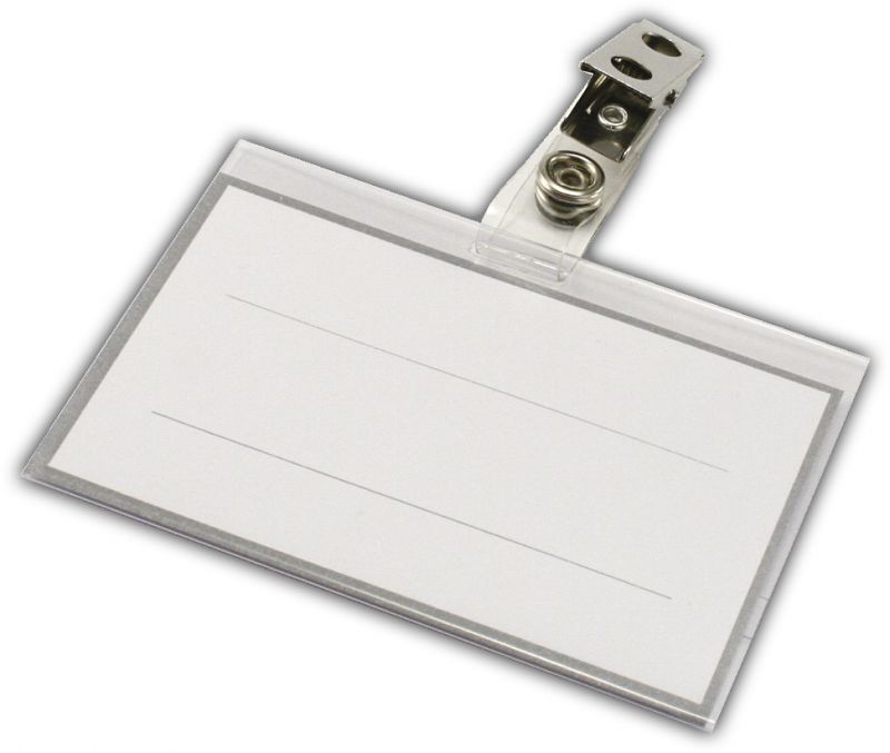 Tuhá, čirá visačka z PVC. Uchycení na oděv pomocí klipsy. Vkládání jmenovy z boku. Rozměr 65 x 90 mm.