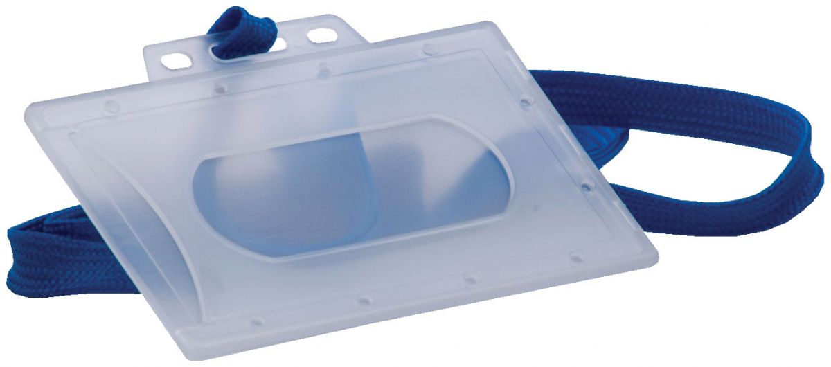 Tuhá plastová visačka pro kreditní karty rozměru 54×86 mm s modrou sňůrkou na krk. Jedna strana s oválným otvorem pro snadné vsunutí karty. Balení 50 ks.