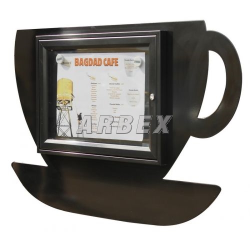 Jednostranná venkovní vitrína s tématickým motivem v pozadí. Vitrína i motiv jsou lakovány práškovou vypalovanou barvou.