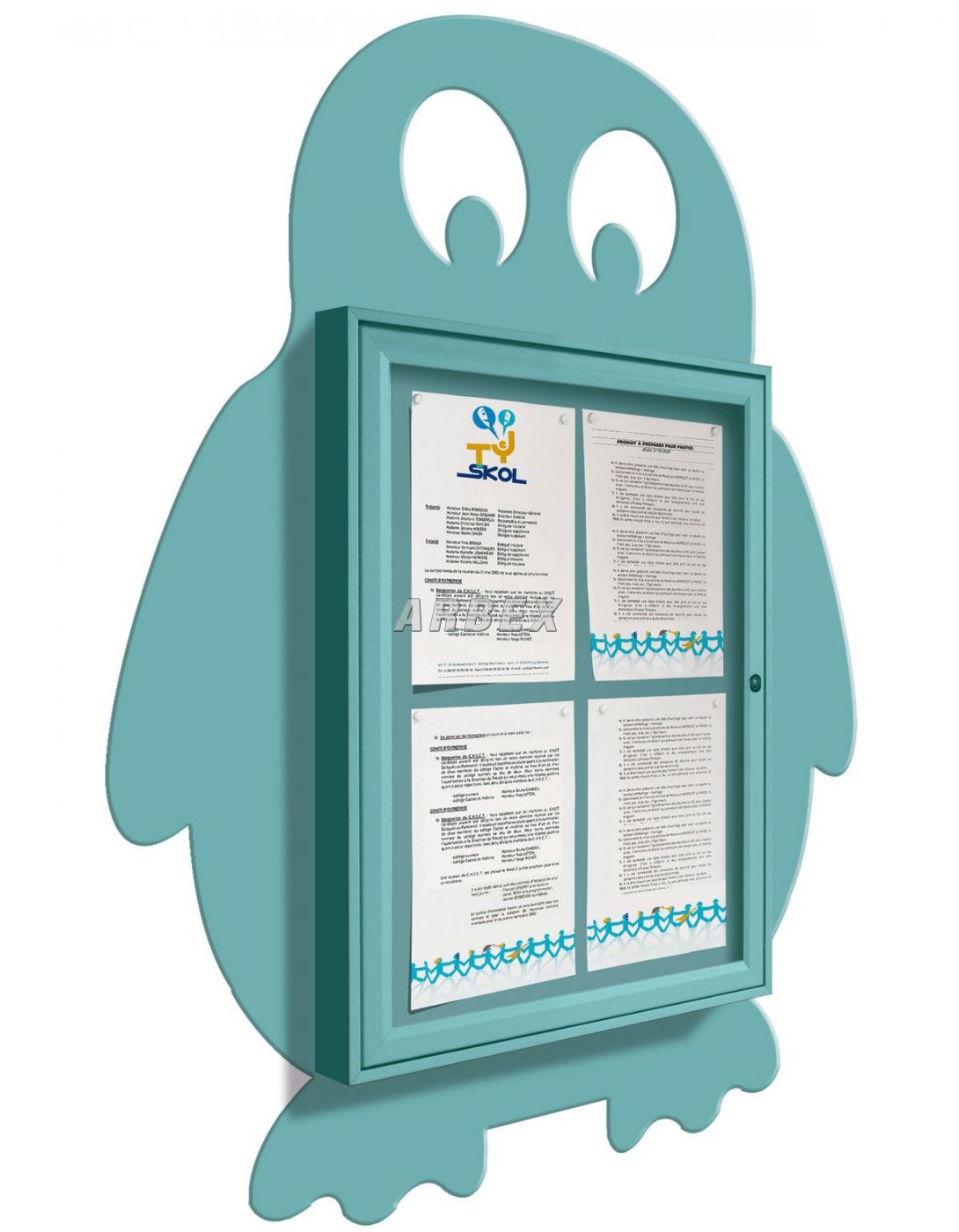 Jednostranná venkovní vitrína s dětským motivem v pozadí. Vitrína i motiv jsou lakovány práškovou vypalovanou barvou.
