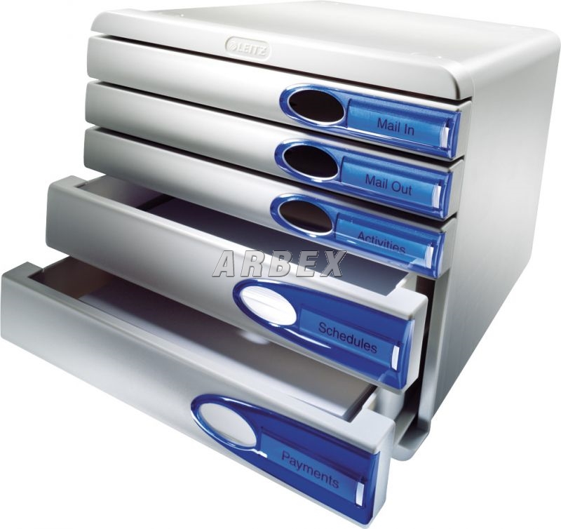 Vyrobený z kvalitního plastu. Možnost stohování (až 3 boxy na sebe) nebo jeho pověšení na stěnu. Zásuvky jsou uzavřené. Součástí balení jsou gumové podložky pro lepší stabilitu a ochranu nábytku a popisovatelné papírové štítky. Přímá náhrada za zásuvkový box Esselte Intrica. Pro ukládání dokumentů do formátu A4+. Jednoduchý posun zásuvek se zarážkami, proti jejich úplnému vysunutí. Na každé zásuvce výřez pro snadné vysunutí zásuvky. Rozměry: 275 x 245 x 345 mm. 2 zásuvky výšky 48 mm 3 zásuvky výšky 32 mm