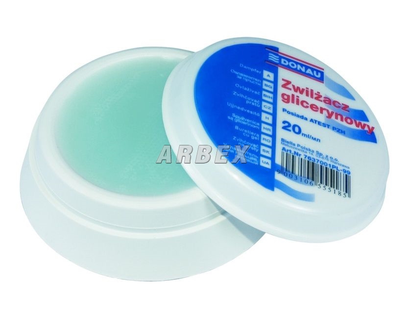 Glycerinový zvlhčovač prstů nezanechává mastné skvrny na papíře. Vyznačuje se jemnou vůní máty. Netoxické složení, na bázi glycerinu. Obal má protiskluzový povrch dna. Průměr podušky: 55 mm. Celkový průměr balení: 80 mm. Neobsahuje nebezpečné složky a gel není škodlivý. Objem: 20 ml.