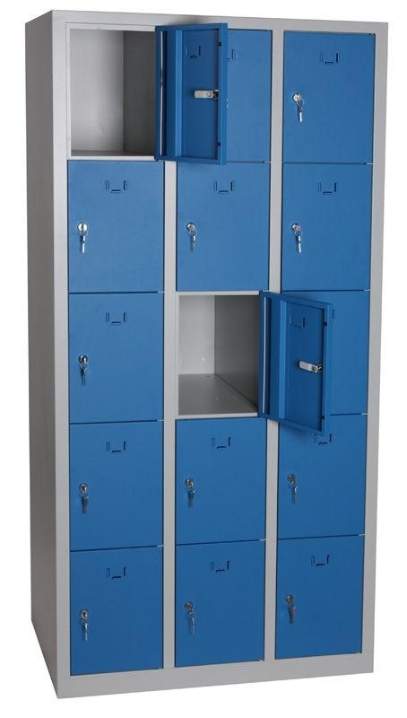 svařovaná kovová šatní skříň s 15-ti boxy pro odkládání osobních věcí zaměstnanců na pracovištích, jako dočasné úschovny apod.
