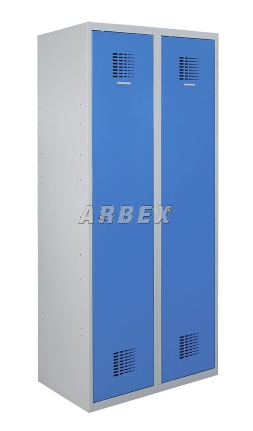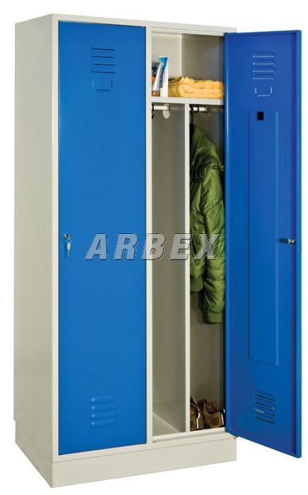 Výbava oddílu - svislá mezistěna oddělující prostor pro pracovní a civilní oděv, polička, tyč na ramínka se 2 háčky, větrací otvory ve dveřích, jmenovka na dveřích, zrcátko, samolepící háček pro ručník.