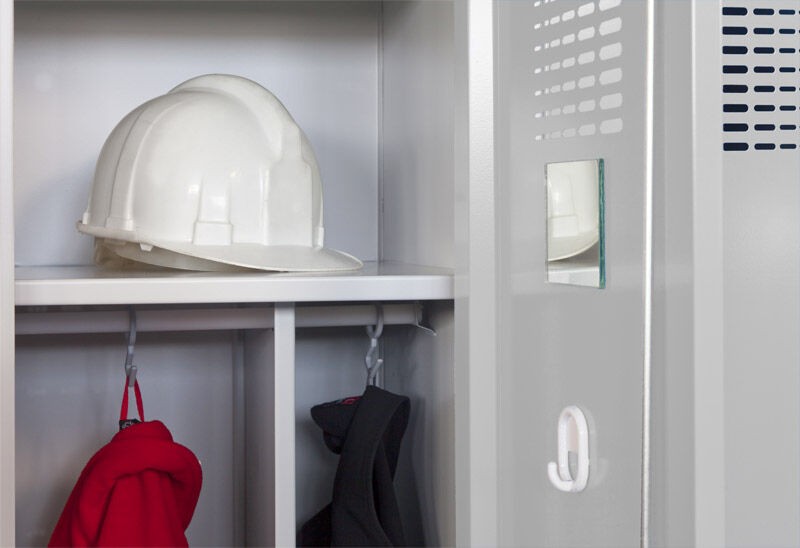 Výbava oddílu - svislá mezistěna oddělující prostor pro pracovní a civilní oděv (rozdělí oddíl na 150 a 250 mm), polička, tyč na ramínka se 2 háčky, větrací otvory ve dveřích, jmenovka na dveřích, zrcátko, samolepící háček pro ručník.