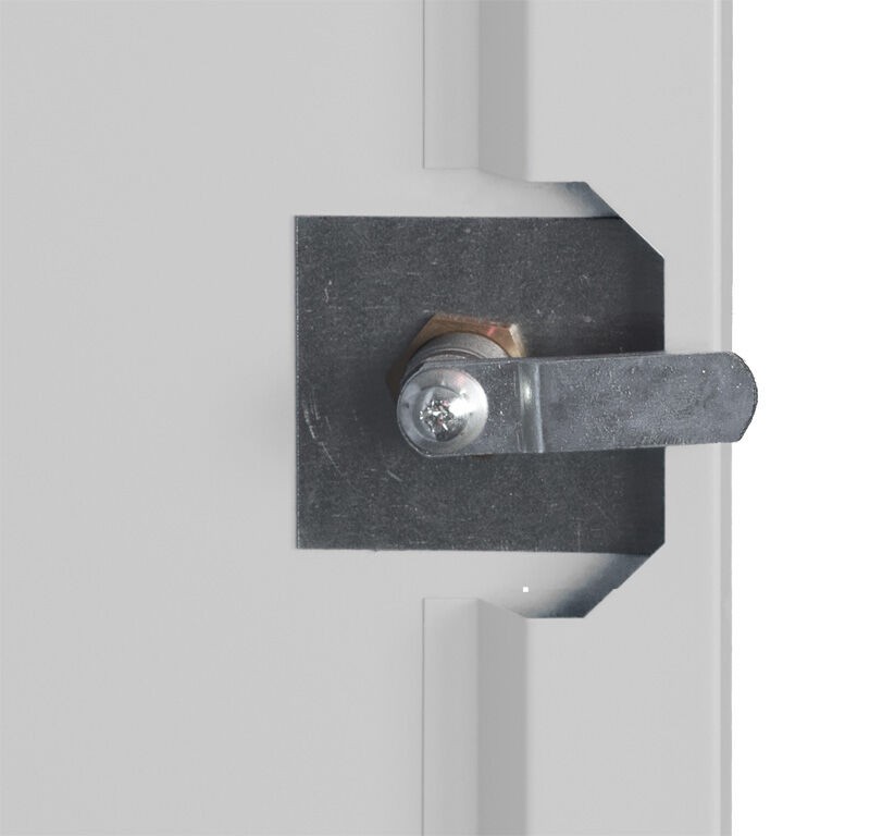 Uzamykání - tříbodový rozvorový mechanismus uzavírající dveře do boku, horního víka a dna skříně + cylindrický zámek se 2 klíči vhodný pro generální klíč.