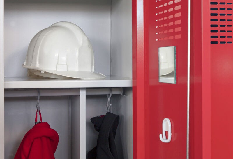 Výbava oddílu - svislá mezistěna oddělující prostor pro pracovní a civilní oděv (rozdělí oddíl na 150 a 250 mm), polička, tyč na ramínka se 2 háčky, větrací otvory ve dveřích, jmenovka na dveřích, zrcátko, samolepící háček pro ručník.
