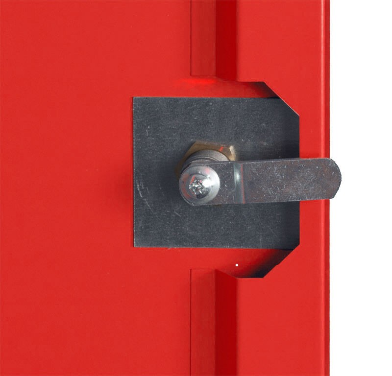Uzamykání tříbodový rozvorový mechanismus uzavírající dveře do boku, horního víka a dna skříně + cylindrický zámek se 2 klíči vhodný pro generální klíč.