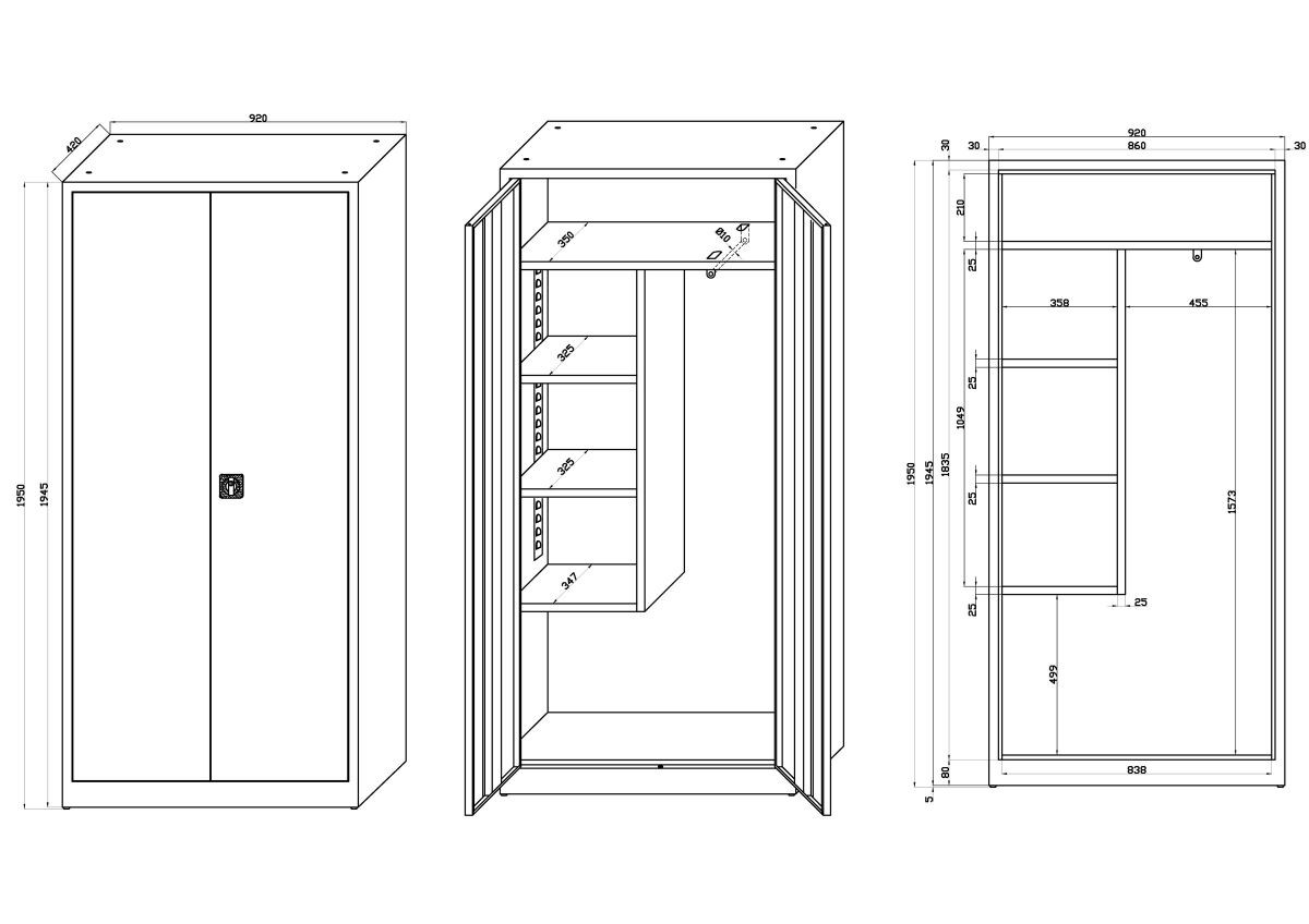 Vnější rozměry skříně v x š x h = 1950 x 920 x 420 mm.