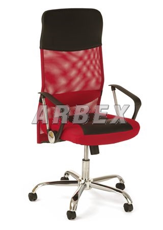 , koženka, látka červená, chromovaný kříž, plynový píst, houpací mechanismus