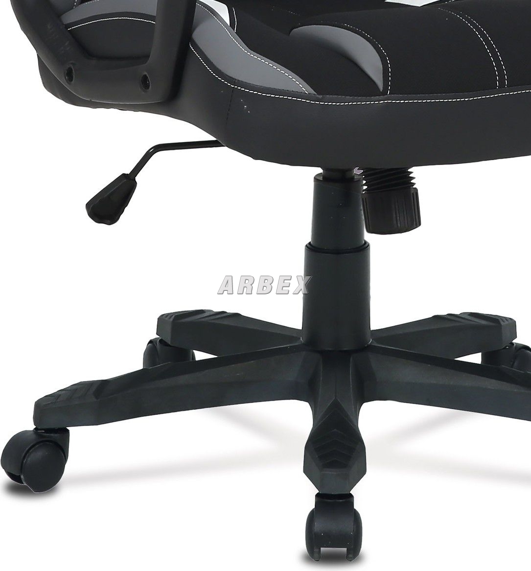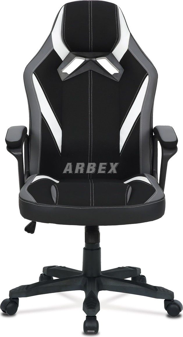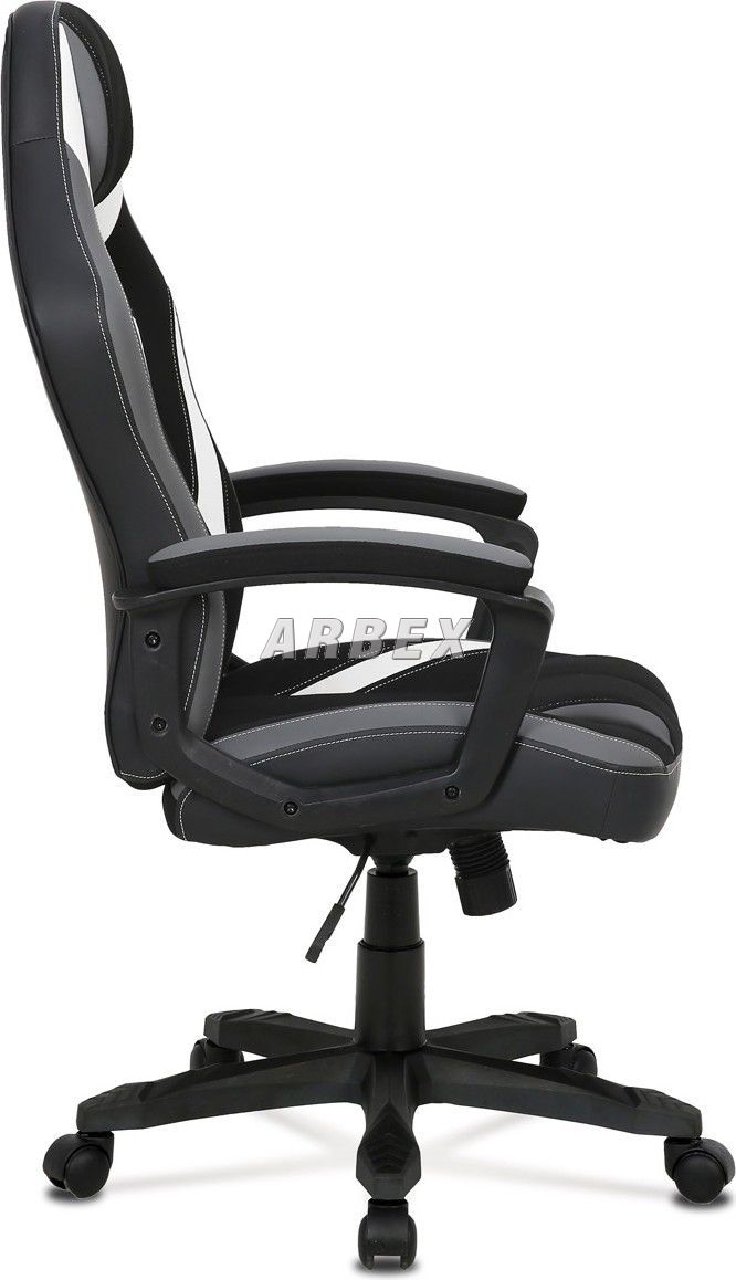Elegantní a výrazné sportovní kancelářské křeslo v designu sedačky závodního vozu a zaoblenými liniemi. Má výborné ergonomické rozvržení. Potah je kombinací černé a šedé látky a bílé ekokůže, s decentním bílým prošíváním celého křesla. Kostra je z ocelových ohýbaných trubek. Masivní polstrování sedáku i opěráku z kvalitní PU pěny je zárukou pohodlného posezení při herních večerech. Ruce si můžete pohodlně položit na pevné plastové područky, opěrky jsou rovněž polstrované a potažené černou a šedou látkou. Křeslo je vybaveno houpacím mechanismem. Síla houpání se reguluje plastovým šroubem pod sedákem. Výška sezení se upravuje páčkou na pravé straně přes kvalitní plynový píst. Masivní černý plastový kříž s černými protiskluzovými doplňky je osazen plastovými kolečky vhodnými na koberce. Nosnost židle je 120 kg. Kvalita zpracování, důraz na pohodlí a ergonomii zaručuje pohodu při dlouhých herních večerech i denní kancelářské práci. A díky barevným liniím se stane výrazným a nepřehlédnutelným solitérem.