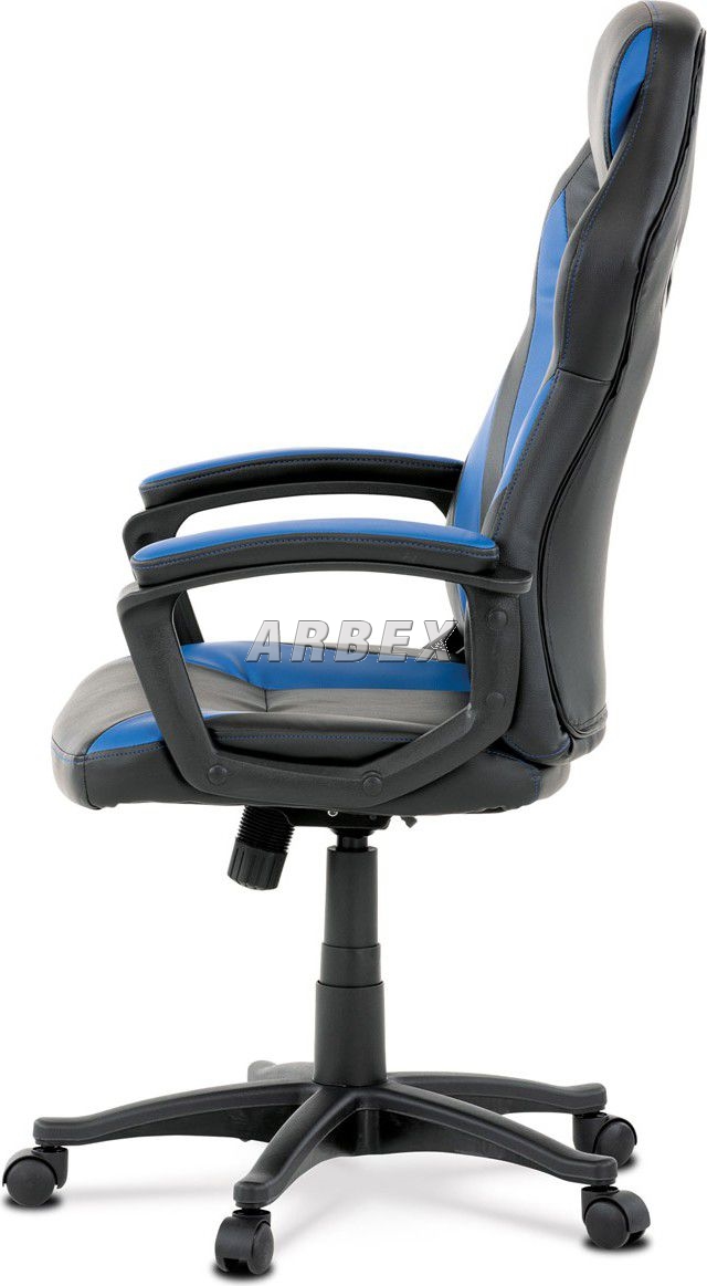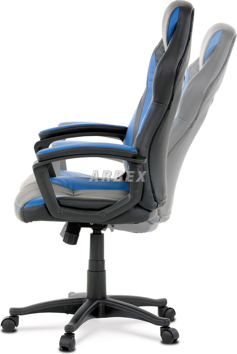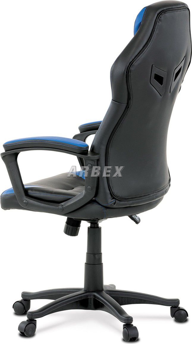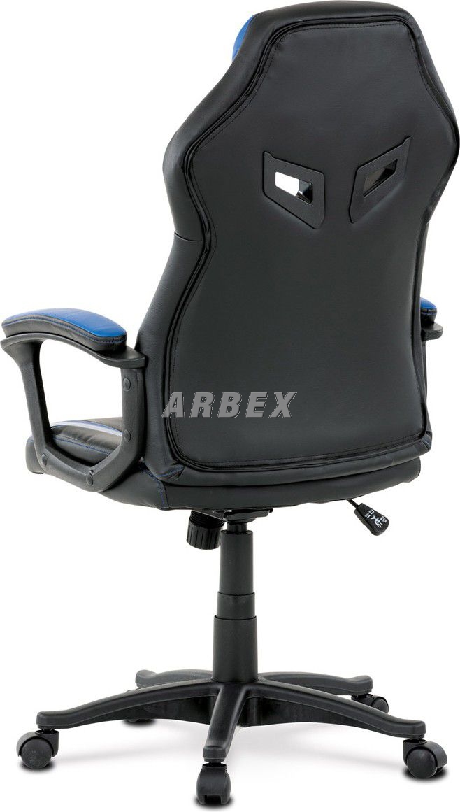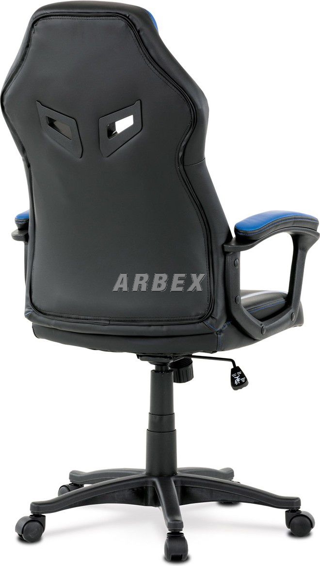 Elegantní herní židle v designu sedačky závodního vozu v provedení Dark Style se zaoblenými liniemi ve výrazném kontrastu s ostře řezanými rysy plastového lemování otvorů na „bezpečnostní pásy“. Tyto designové otvory v horní části opěráku nejen potřebný závodní vzhled, ale také usnadňuje manipulaci. Potah je kombinace modré a černé ekokůže. Obvodové prošití je v modrém odstínu. Polstrování je z kvalitní PU pěny. židle je vybavena houpacím mechanismem s nastavením protiváhy a aretací v základní poloze. Tuhost protiváhy lze regulovat velkým plastovým šroubem, umístěným pod sedákem. Výška sezení se upravuje páčkou na pravé straně přes kvalitní plynový píst. Ruce unavené z hraní si můžete pohodlně položit na plastové područky, na ložné ploše polstrované opět modrou a černou ekokůží. Šíře područek je 6 cm, ložná plocha 33 cm a výška 3 cm. Opěrák je vyšší s integrovanou statickou opěrkou hlavy. Kříž je černý plastový o průměru je 64 cm, což zajišťuje výbornou stabilitu i u fyzicky náročnějších her. Kolečka jsou plastová pr. 5 cm, vhodná na koberce. Nosnost židle je až 120 kg. S touto židlí prožijete nejen pohodlí, ale i pohodu při herních večerech i nocích.