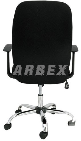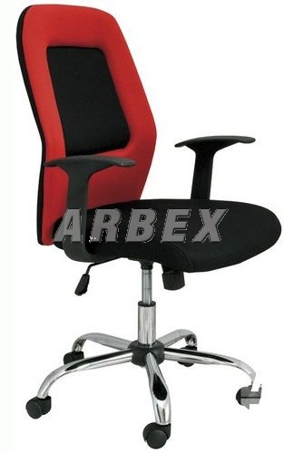 Kancelářská výškově nastavitelná židle s područkami, látková. Chromový kříž s kolečky, plynový píst, houpací mechanismus.