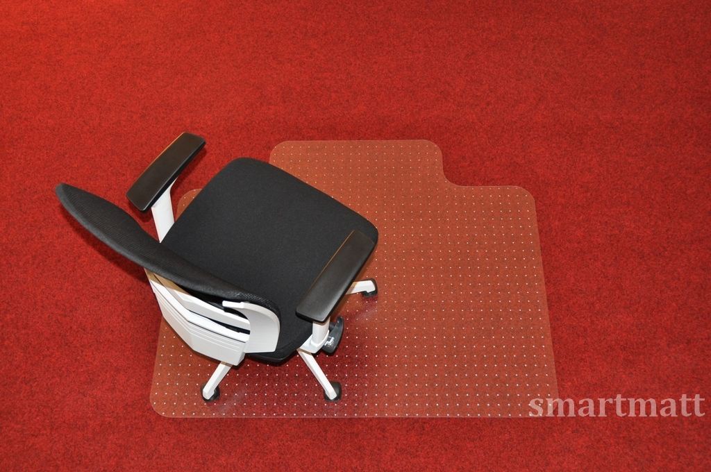 Podložka pod kolečkové židle na koberce. Podložka je vyrobena z kvalitního, nelámavého, oděru odolného a ekologicky zcela nezávadného polykarbonátu. Vrchní strana podložky má drobnou strukturu, která zabraňuje zrcadlovému efektu a umožňuje židlím pohybovat se tiše se správným třením. Spodní strana je opatřena stovkami hrotů pro pevné přilnutí na koberec. Výřez je na delší straně.
