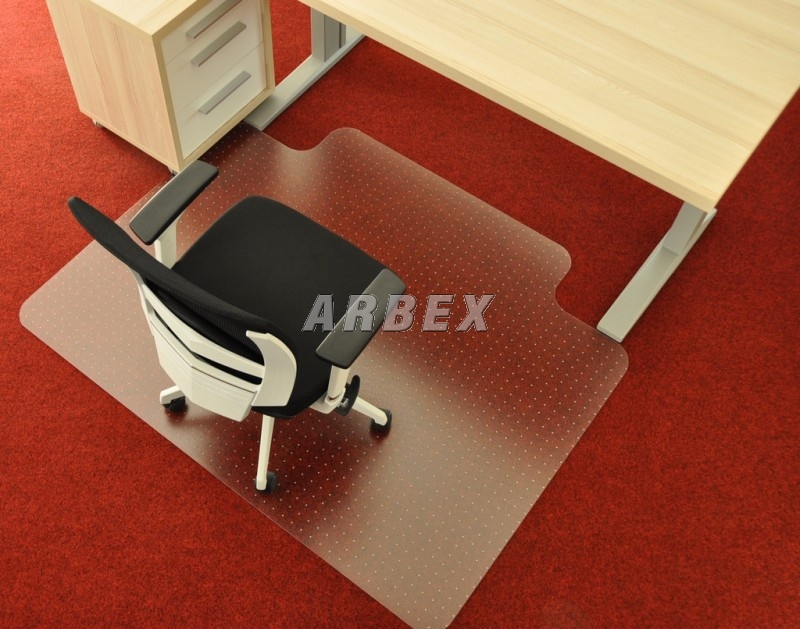 Podložka pod kolečkové židle na koberce. Podložka je vyrobena z kvalitního, nelámavého, oděru odolného a ekologicky zcela nezávadného polykarbonátu. Vrchní strana podložky má drobnou strukturu, která zabraňuje zrcadlovému efektu a umožňuje židlím pohybovat se tiše se správným třením. Spodní strana je opatřena stovkami hrotů pro pevné přilnutí na koberec. Výřez je na delší straně.