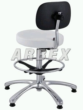 čalouněná laboratorní zvýšená židle,zadní kryt opěry černý plast, výškově stavitelná naklápěcí opěra, stavitelný opěrný kruh na nohy, zvětšený kovový kříž (chrom), kluzáky
