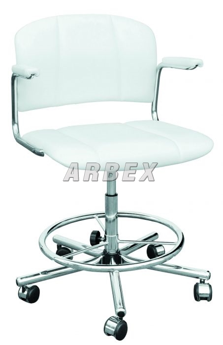 Jednoduchá výškově nastavitelná zdravotnická židle která má kovovou, chromovanou konstrukci.